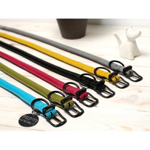 Цей стильний класичний нашийник ручної роботи виготовлений з м'якої натуральної шкіри. Високоякісна шкіра та міцна фурнітура з карбоновим покриттям – запорука тривалої служби виробу. Фурнітура з карбоновим покриттям дуже зносостійка та міцна, гарантійний термін її служби – понад 20 років. Нашийник доступний у кольорах: чорний, гірчичний, блакитний, оливковий, рожевий та сірий.